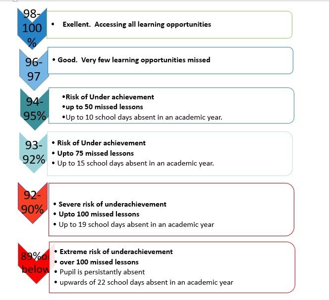 In addition as the government have moved the persistent absence figure from below 85% to below 90% we now also monitor those who had an attendance issue in the previous year and have an attendance figure below 92% during the Autumn term or from Spring term those whose attendance is below 92%. We do this to work with families to ensure they do not fall into the persistent absence category. A letter will be sent home explaining our concern and attendance procedures. Parents will be informed that we will be monitoring attendance and will be given the opportunity to discuss matters with the Head teacher if needed.
