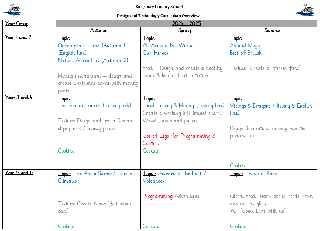 Where possible, D&T lessons are linked to a topic within each phase each term. D&T tasks can be linked to either the topic or an element within the topic or the English text being taught.