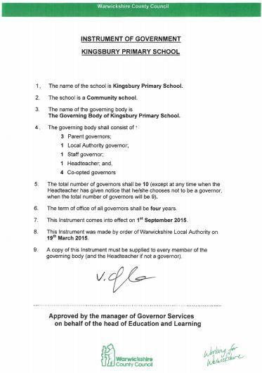 The Governing Body of Kingsbury Primary School was reconstituted in September 2015. Governors are local people who bring their interests and experience to support the school. They are volunteers and are always happy to listen and talk about any matter related to the school and the children.